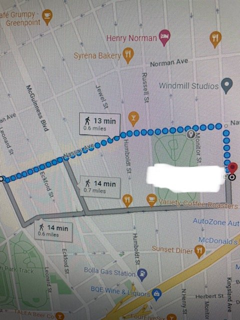 Awful photo, but wanted to show the map of my walk. McGolrick park featured on the border of Monitor Street. And I erased the exact address of the apartment I was going to.